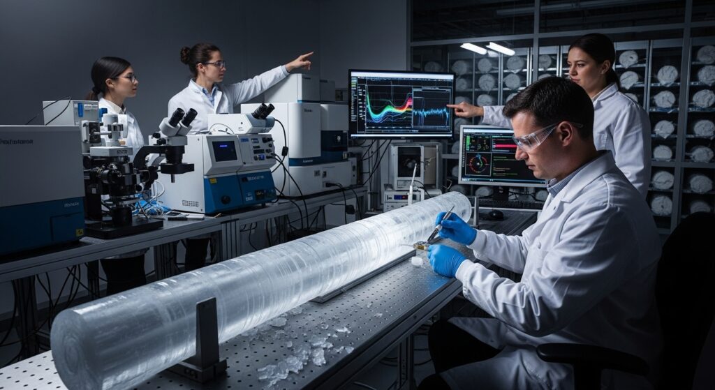 Eisbohrkerne sind wahre Zeitkapseln. In Regionen wie der Antarktis oder Grönland häuft sich Schnee über Jahrtausende an, presst sich zu Eis zusammen und fängt dabei Luftblasen, Staub und Pollen ein. Bohrungen wie die EPICA Dome C in der Antarktis reichen bis zu 800.000 Jahre zurück und sind bis zu 3 Kilometer tief.